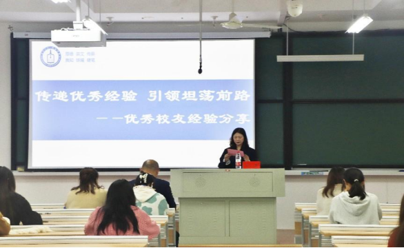 学生做经验分享,院党委副书记虞岚、学院辅导员以及学生代表近80人参与了此次讲座。