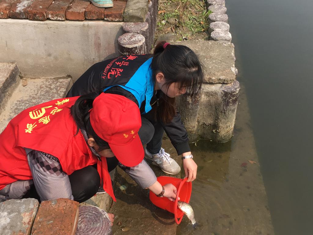 上午9点半,志愿者们一起开始组队并分发鱼苗,与天凝镇洪溪小学的小朋友们两两结对,共同将“游动的小生命”放养河道,将希望种在愈加清澈的河水中。据洪溪村河长介绍,放归鱼苗有助于河道生态系统的恢复。