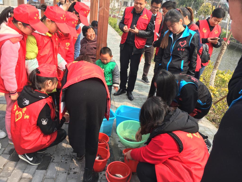 跟小学生一起放生鱼苗,将小生命还给大自然