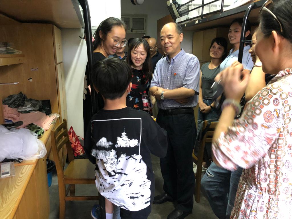 两位来自西藏的新生。张书记与新生以及新生的家长进行了亲切地交谈,了解了他们初到学校对于寝室环境、校园设施、食堂就餐的适应情况后,提醒他们尽早适应气候、饮食方面的差异,并以自己的亲身经历和体会,鼓励新生能够尽快转变角色,熟悉新的环境,团结同学,处理好各种人际关系,以积极的心态和良好的面貌面对大学生活。学院领导也表示,学院非常关心西藏学生的在校学习和生活,会通过一个西藏学生结对一个党员的方式帮助西藏学生尽快适应、融入大学生活。
