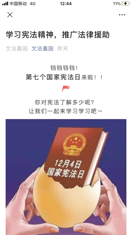 12月3日,法学专业师生党员一起推出了“学习宪法精神,推广法律援助”线上宣传活动,通过推文宣传普及宪法的基本知识,同时推出线上法律咨询和援助平台,师生们联合浙江子城律师事务所党支部的资深律在微信端师为有需要的群众提供法律在线咨询服务。此外,支部成员还为嘉兴市强制隔离戒毒所的戒毒人员录制宪法知识教育视频,讲解宪法如何保障公民的权利与义务等宪法知识,利用自身专业知识发挥教育作用,传播正能量。