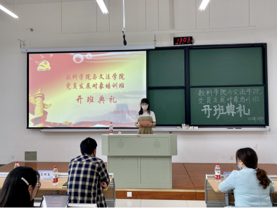 在激昂的国歌声中,开班典礼拉开了序幕。礼毕,艾芮玄老师为同学们介绍本次发展对象培训班学员及课程设置情况,对培训班课程安排、纪律问题等事宜做简单讲解。接着,数学191班的叶燕玲同学代表入党积极分子向党组织表态:作为入党积极分子将在党组织的领导下继续努力,向党员们学习,自觉加强党性修养,牢记党的宗旨,勤于钻研,开拓进取,勇于创新。最后,李寒星老师作培训班学习动员,着重强调了三个方面:一要珍惜本次培训机会,牢牢把握机遇,努力提高自己的政治素养;二要讲求方法效率,在学习中加强理论和实践的联系,争取做到学有所成;三要尊师守纪,遵循培训班的上课纪律,以一个党员的标准严格要求自己。
