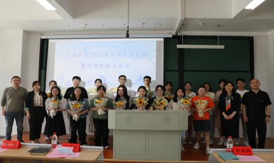 在厚德楼122教室举行2022届考研表彰大会暨考研经验分享会。学院领导班子、系部主任、考研服务工作室指导老师和学工办全体老师参加了本次会议。