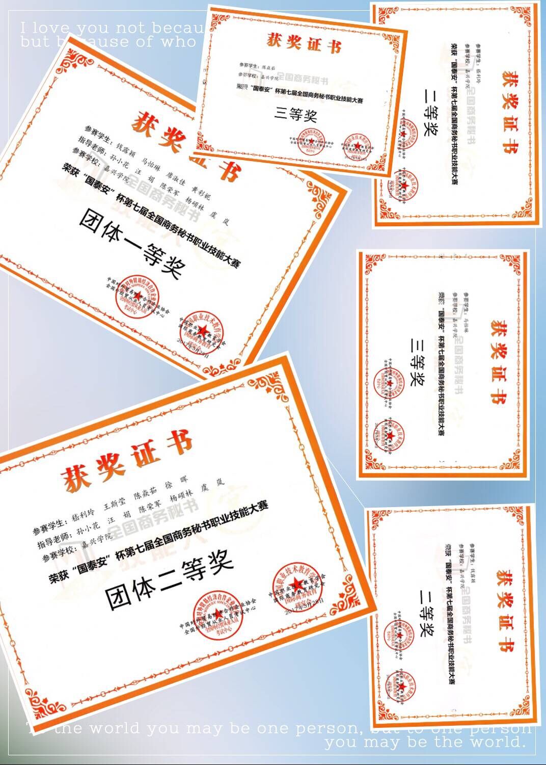 5月28日,“国泰安”杯第七届全国商务秘书职业技能大赛在浙江警官职业学院落下帷幕。来自全国的63个院校,近96支队伍参加了本次大赛,各参赛队在比赛中同场竞技,赛出了自己的风采。嘉兴学院两支参赛队在赛场发挥稳定,成绩优秀,嘉院一队和二队分别荣获团体一等奖、二等奖;参赛队员嵇利玲、黄彩妮、钱露颖荣获个人综合成绩二等奖,席淑佳、马怡琳、陈焱茹、徐晖荣获个人综合成绩三等奖。
