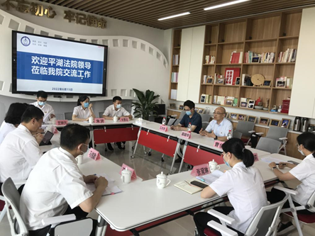 6月15日下午,平湖法院马伟勤副院长一行来18jav 交流工作,18jav 副院长(主持工作)童建华、法学系马存利和曹佳老师参与座谈。