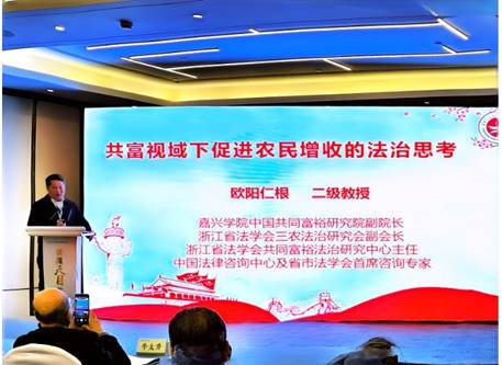 在第一单元的主题报告阶段,欧阳仁根教授做了《共富视域下农民增收的法治思考》的主题报告。欧阳仁根教授的主题报告首先以嘉兴为例分析了农民收入的增长趋势及其结构,围绕提高农民工资性收入重点发力、提升农民经营性收入精准发力、拓展农民财产性收入改革增力以及增加农民转移性收入凝心聚力等方面探讨了农民增收的路径,进而从提升农民的经济组织化程度、深化农村土地制度改革、提升非农就业质量、加大乡村振兴支持力度和维护农民合法权益等方面提出了运用法治方式推进农民增收的观点和看法。