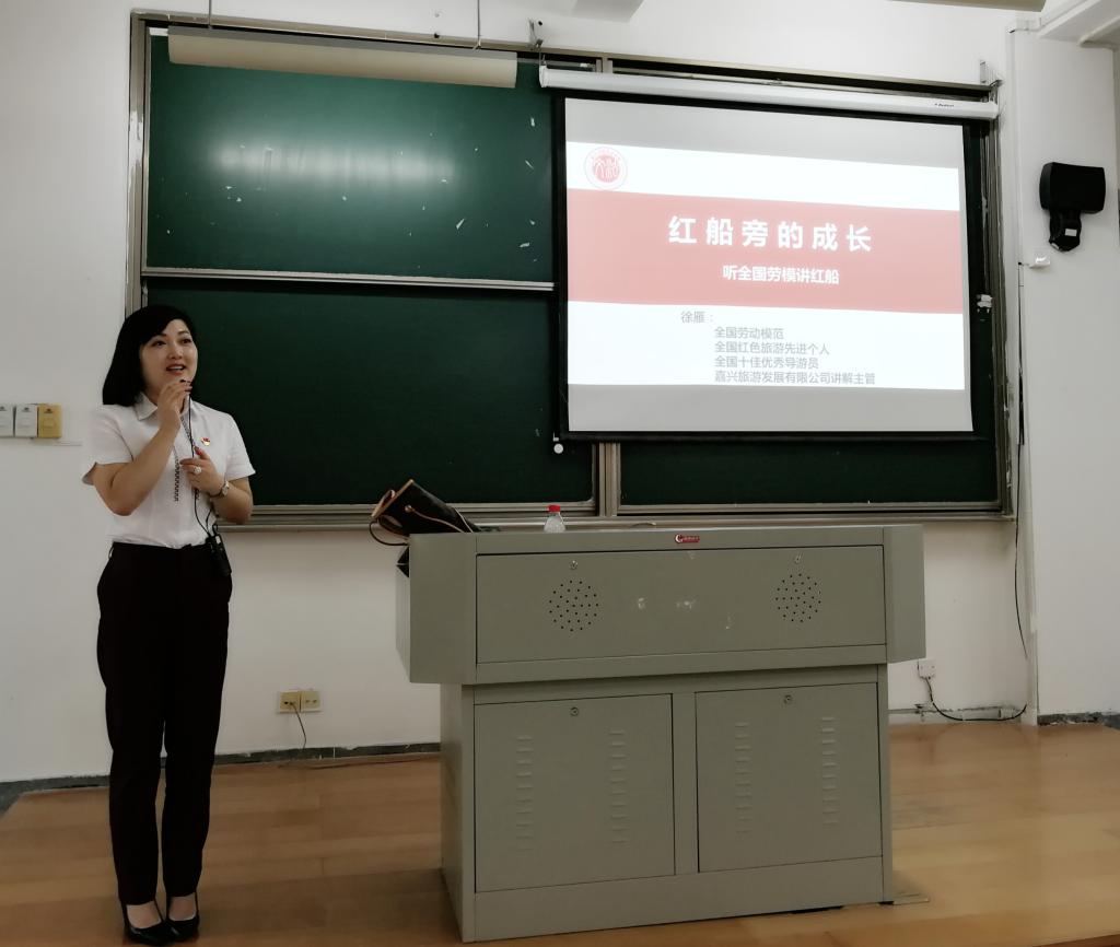 徐雁结合丰富的工作阅历,首先向全体党员讲述了自身对红船旁讲解员工作的责任感、使命感,从一名讲解员新人历经磨练成长为光荣的全国劳动模范;其次以中共一大为主线深入介绍了嘉兴南湖红船的历史故事,特别讲解了红船精神的历史意义与时代价值;最后从嘉兴南湖景区旅游发展的角度分享了南湖旅游景区讲解员的使命担当与专业化队伍建设。徐雁还就学生党员们提出的困惑进行了答疑。