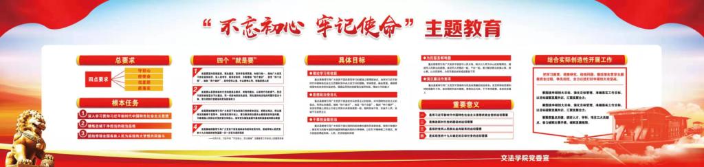 学院党委坚持以习近平新时代中国特色社会主义思想为指导,以高标准高质量高水平为目标开展“不忘初心、牢记使命”主题教育,扎实做好主题教育工作宣传,将“不忘初心、牢记使命”主题教育根本任务、总要求、具体目标图解上墙,明确学院开展主题教育的整体思路脉络,为持续推进落实主题教育活动营造良好氛围。