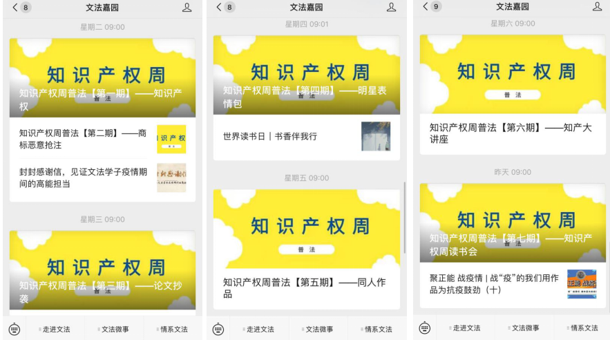 嘉兴学院法学师生党员利用文法嘉园公众号平台,面向校内外受众推出为期一周的知识产权普法系列推文,内容既涉及知识产权基本理论知识,也涉及当前的热点问题和案例。同时,法学专业党支部的同学们还开展线上知识产权有奖竞答活动,丰富的活动内容吸引了学院同学频频点赞和转发,并得到法学老师们的肯定。