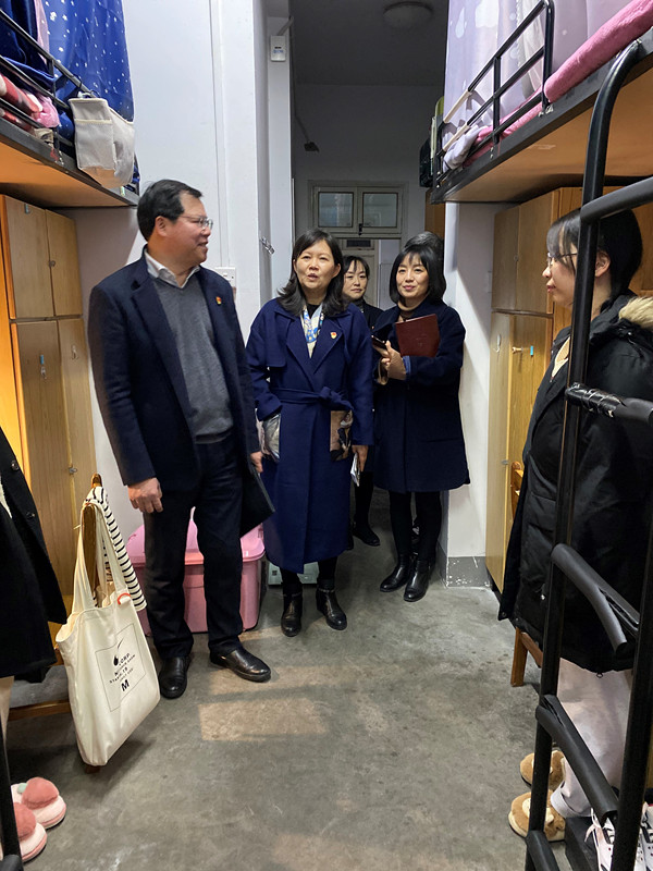 2020年12月7日下午,嘉兴学院党委副书记吴云达一行在18jav 党委书记洪坚、党委副书记虞岚的陪同下走访了18jav 的结队宿舍,看望了宿舍同学,给同学们带去了关心与问候。