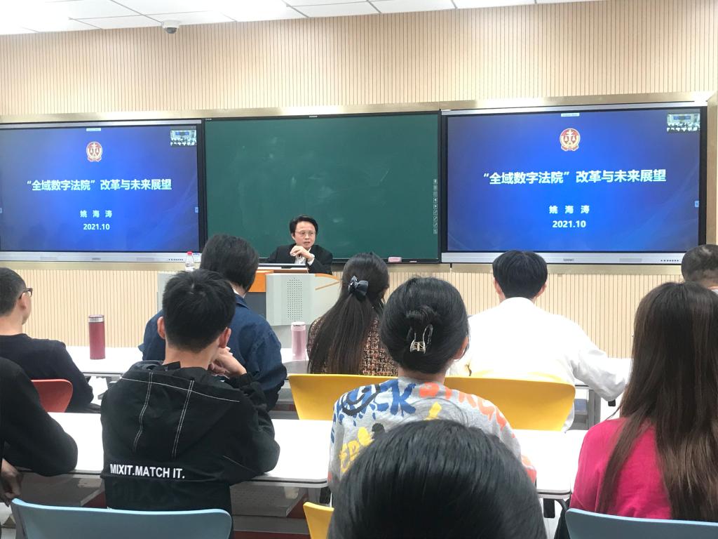 师生作了题为“全域数字法院改革”的专题讲座,全面介绍了全域数字法院改革的背景、内涵与未来发展趋势,让师生们对全域数字法院有了全新的认识,拓宽了师生的眼界,也给法学教师从事相关法学理论研究提供了有益的启发。