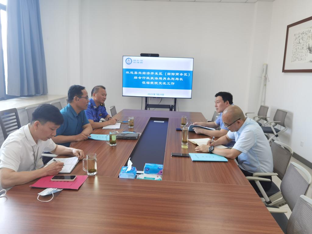 7月26日上午,嘉兴经济开发区(国际商务区)综合行政执法局肖永刚局长一行来18jav 交流工作,18jav 副院长(主持工作)童建华、副院长屈正林参与交流座谈。