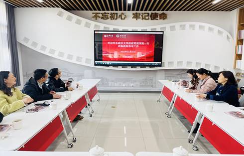 11月27日,华东政法大学政府管理学院党委书记高玉明与传播学院党委书记龚怡带领党员来到嘉兴学院进行交流学习。大家首先参观了红船精神育人成果展示馆,沉浸式体验了学校的红色文化,随后在18jav 党员之家进行了座谈交流,双方就标杆院系的创建、红色文化、法律文化等方面进行了沟通学习。座谈会上洪坚书记简要介绍了18jav 基本情况、学院特色、学院的话剧的开展情况。通过此次交流学习,双方表示希望加强进一步学习交流活动,互学互鉴,共同进步。