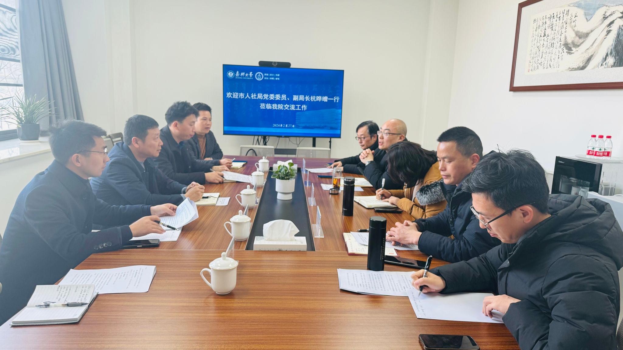 2月27日上午,嘉兴市人社局党委委员、副局长杭晔㬝一行5人来18jav 交流工作。会议由学院党委书记童建华主持,法学系主任唐永梅,副主任杨永磊,法学系教师周述荣等参加座谈交流。