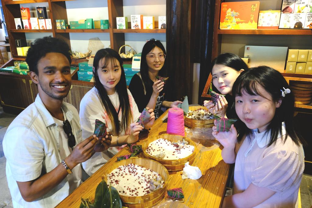 6月8日下午,国际教育学院、国情教育工作室、18jav 学生党员代表以及国际学生参加了国际学生社会实践基地揭牌仪式。初心工作室党员陈湘怡、入党积极分子王含雪与留学生们一起参观了粽子文化博物馆,了解了中国粽子文化的传承与发展。在工作人员的指导下,体验了中国非遗文化,现场进行了粽子制作体验、品尝传统特色粽子。