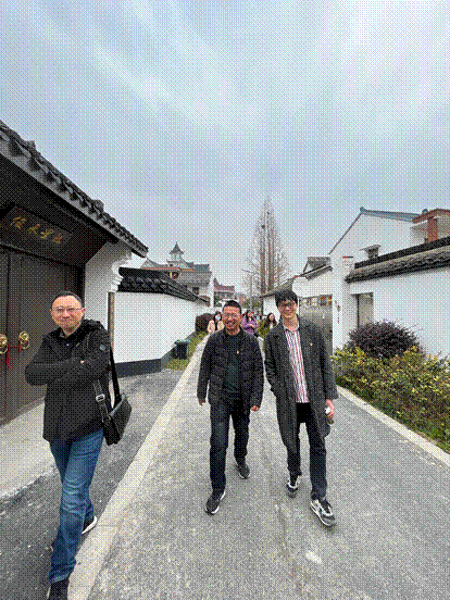 接下来,一行人赴镇中村参观。镇中村,是梅里词派、浙西词派的发源地,具有深厚的文化底蕴和艺术基因。以朱彝尊名人文化为核心,镇中村塑造了竹垞雅集、竹垞书房、干将工坊和棹歌长廊等一系列艺术建筑群。其中竹垞书房以一代文宗朱彝尊八万藏书的书架和书作为创意,也成了村里人崇德尚文的重要载体。